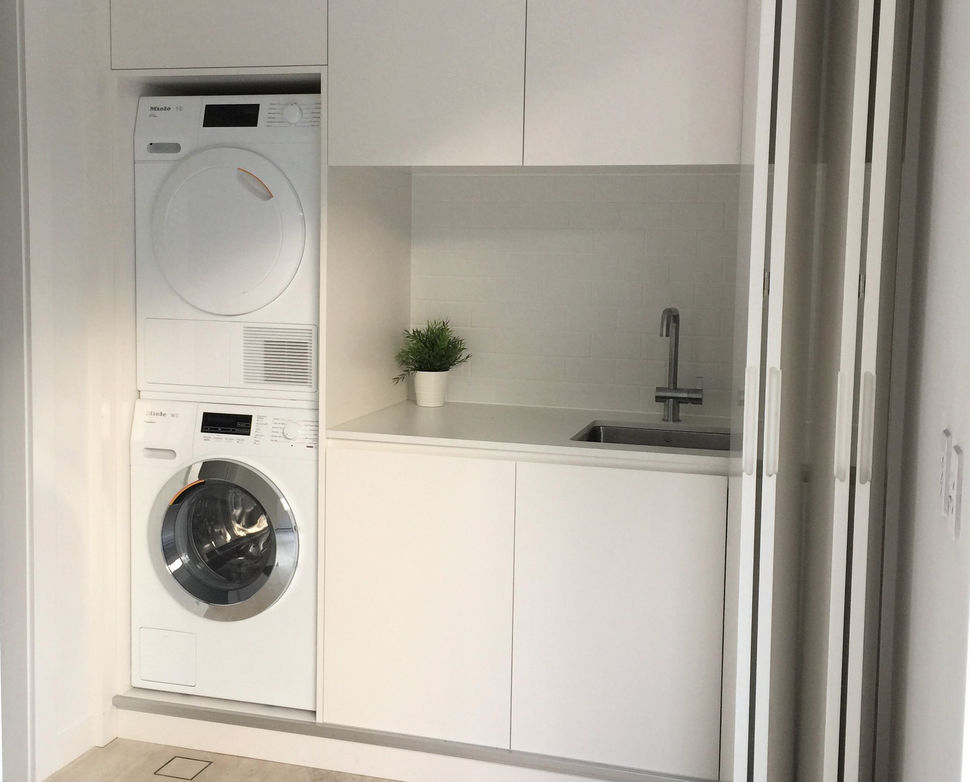 White Silestone benchtops feature in the kitchen as well as the bathrooms custom vanity to keep the space feeling light and open.